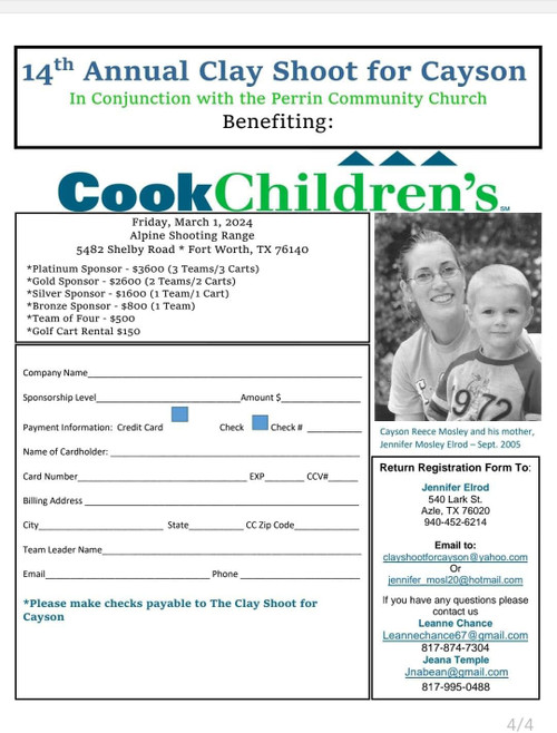 Sporting clays shoot to benefit Cook Children’s CARE Team. If your interested please email clayshootforcayson@yahoo.com or call 940-452-6214