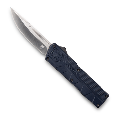 Introducing the lightweight nypd blue (out the front) knife.With a great feel and excellent action, it's suited for everyday usage.This knife features a pocket clip and a nylon sheath.It also features a 3.25" d2 steel blade, and 4.5" high-grade aluminum alloy handle, and it is dual action otf (offer the front).
