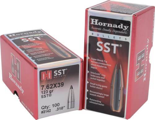 Short for "super shock tip", the hornady sst is designed to deliver tremendous shock on impact while expanding quickly and reliably, particularly at higher velocities.Flat shooting and deadly accurate, it's an ideal bullet for whitetails, as well as most north american game animals from antelope to moose and similar-sized african plains game.The sleek polymer tip increases the ballistic coefficient, while the secant ogive boat-tail profile gives hunters the speed, ballistic efficiency and downrange energy they're looking for.It utilizes an inter-lock ring which ensures the core and jacket remain locked solid during expansion.